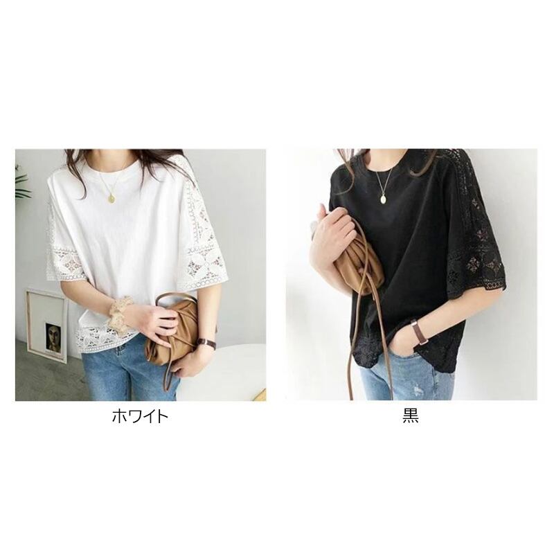 【非即納】新作 レディース シャツ Tシャツ ブラウス フリル チュニック 五分袖 透かし編み 透け感 白 黒【tops433】